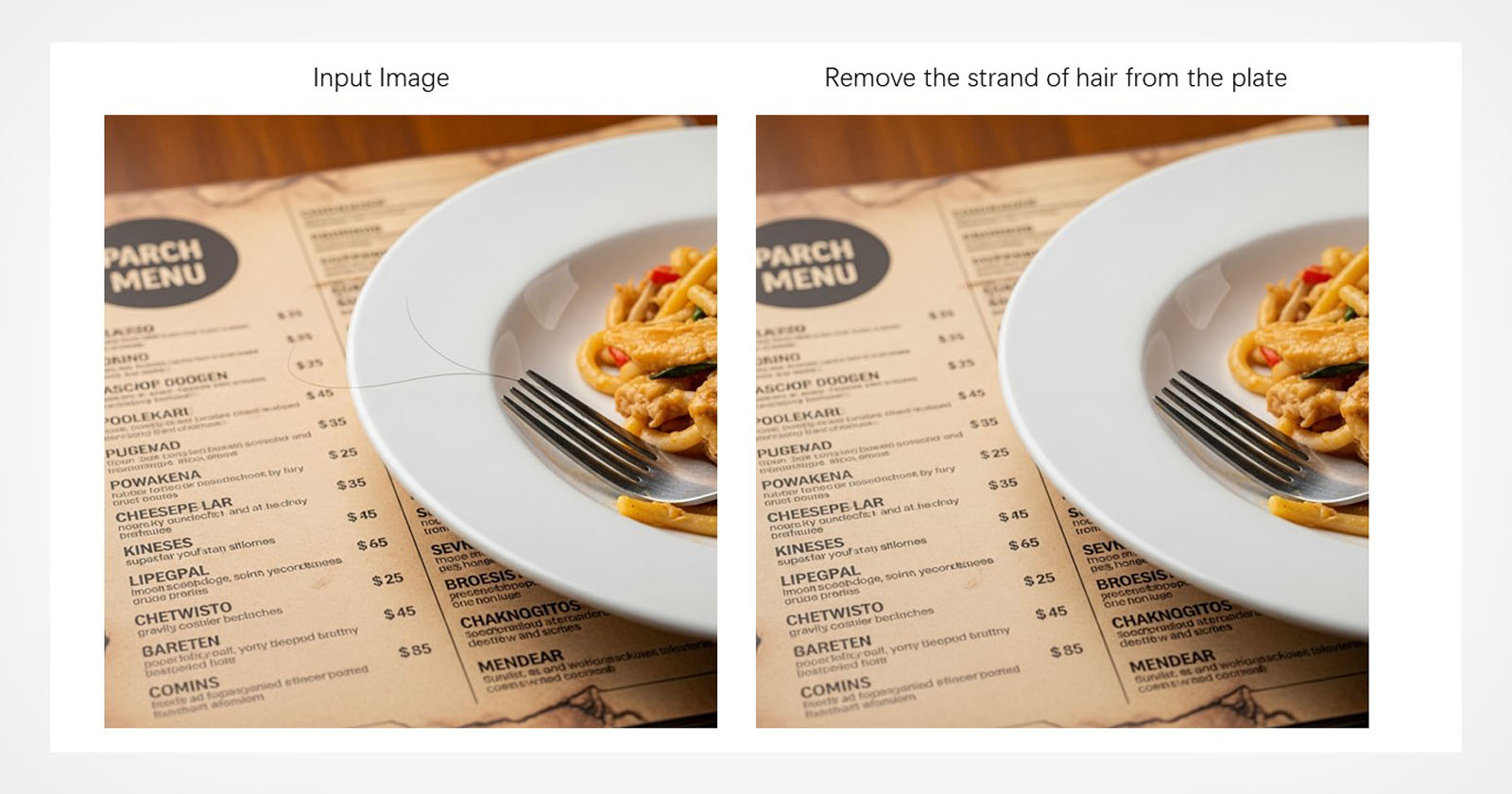 Side-by-side images of a plate of pasta on a menu. The left image shows a strand of hair on the plate; the right image shows the same scene with the hair digitally removed.