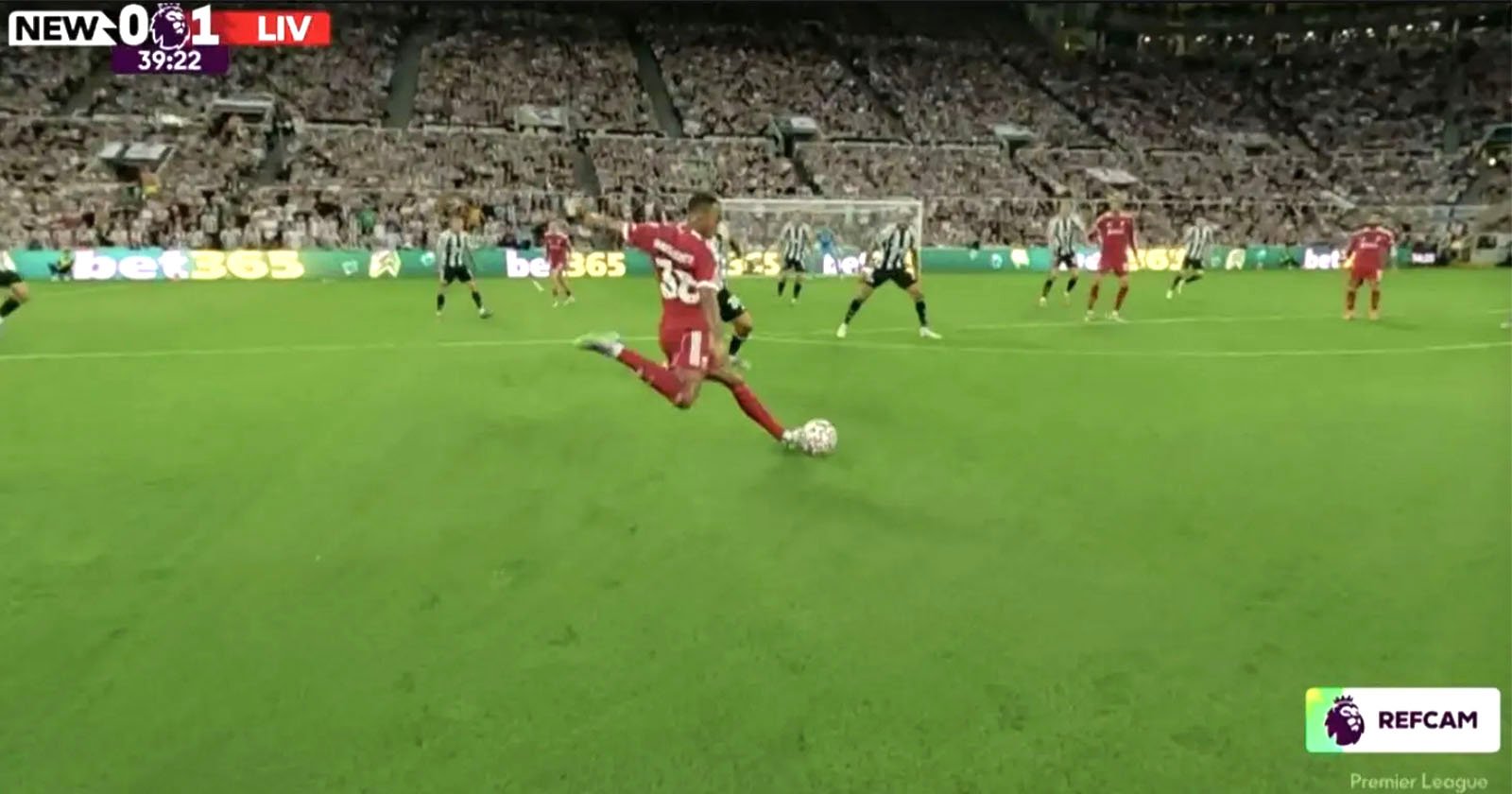 A Liverpool player in a red kit kicks a soccer ball during a match against Newcastle United, with the goalkeeper and defenders ready. The score is 0-1, and the crowd fills the stadium seats.